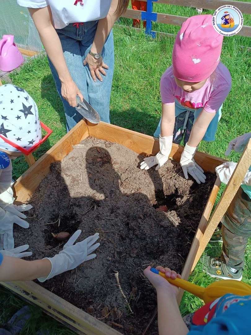 Ребята, в подготовленные ранее короба, высадили картофель сорта "Уника" и "Киви". Дети узнали о составе картофеля и об условиях его выращивания.